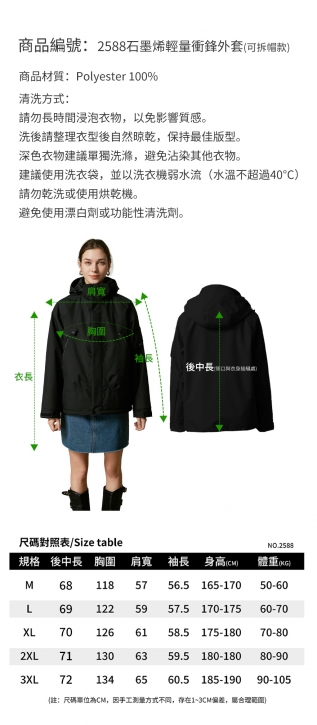 商品名稱:石墨烯輕量衝鋒外套(可拆帽,鋪棉款)NO.2588-